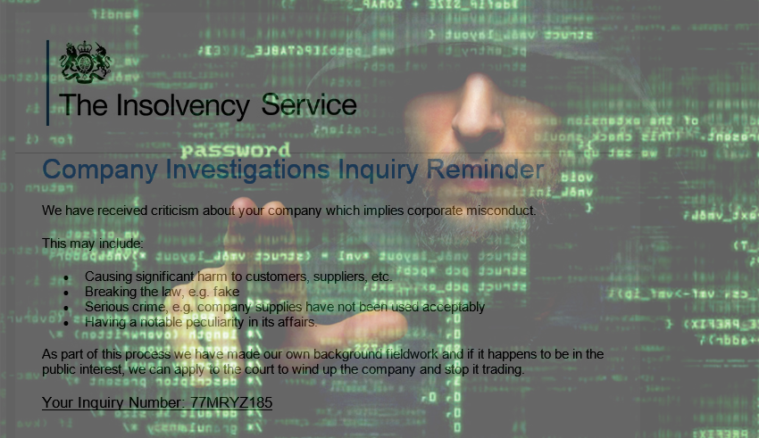 The Insolvency Service scam emails By Will Wisser Posted on December 23, 2016 1 min read 0 4,252 In a bid to implement a new phishing model, cybercriminals have recently launched an email scam campaign abusing the Insolvency Service agency’s name. Business owners in the UK are confronted with a new massive scam wave revolving around false corporate misconduct. Online fraudsters have been sending rogue Company Investigations Inquiry Reminders (Notifications or Notices) purportedly on behalf of the Insolvency Service, a well-known British executive body. These emails look fairly plausible because they contain the agency’s logo and such technicalities as the list of reasons for the investigation and the recipient’s inquiry number. The executives of targeted companies are being intimidated by the following phrase, “We can apply to the court to wind up the company and stop it trading.” At the very least, such statements call forth apprehension of running out of business and encourage victims to look into the case and learn more details. At this point, the phishing part of the hoax comes into play. The Insolvency Service scam: fake Company Investigations Inquiry Reminder The hyperlink saying “INQUIRY INFORMATION” is the main catch in this whole hype. Having clicked on it, users end up on a page that requires them to enter a captcha combination before they can visit the supposed site with details of the imputed misconduct. This tactic is probably intended to add more authenticity to the fraudulent mix. However, as soon as the code is entered and submitted, an offending script on the page will download a ZIP archive with JS file in it. The goal of this malicious JavaScript is to run another object on the user’s machine. The combo of ZIP and JS has become notorious with the rise of crypto ransomware, posing the most widespread contamination vector. That being said, the obfuscated script can execute arbitrary code, not necessarily ransom Trojans. One way or another, it’s clear that the Insolvency Service email scam aims at depositing malicious software on PCs. The genuine organization has already published an email scam warning on its official page, emphasizing that the messages are bogus and that recipients must not click on any links in them. Overall, email hoaxes impersonating UK government departments are popular with cybercrooks. The HMRC scam circulating earlier this year used fake tax refund notifications to dupe taxpayers into filling out their personal information, including credit card details, on a phony refund form. When confronted with this sort of a predicament, it’s strongly recommended to abstain from following links embedded in the spoof email, otherwise a malware attack is imminent. Scan your PC for the Insolvency Service scam related viruses The links in rogue Company Investigations Inquiry Notices pretending to be from the Insolvency Service may point to drive-by downloads and exploit kits. To ascertain that no malware ended up inside your computer this way, consider checking it for all types of infections. The recommended software can quickly locate threats, eradicate them and remediate all harmful changes. So go ahead and do the following: 1. Download and install the antimalware tool. Open the solution and have it check your PC for PUPs and other types of malicious software by clicking the Start Computer Scan button Download Insolvency Service scam malware remover 2. Rest assured the scan report will list all items that may harm your operating system. Select the detected entries and click Fix Threats to get the troubleshooting completed.